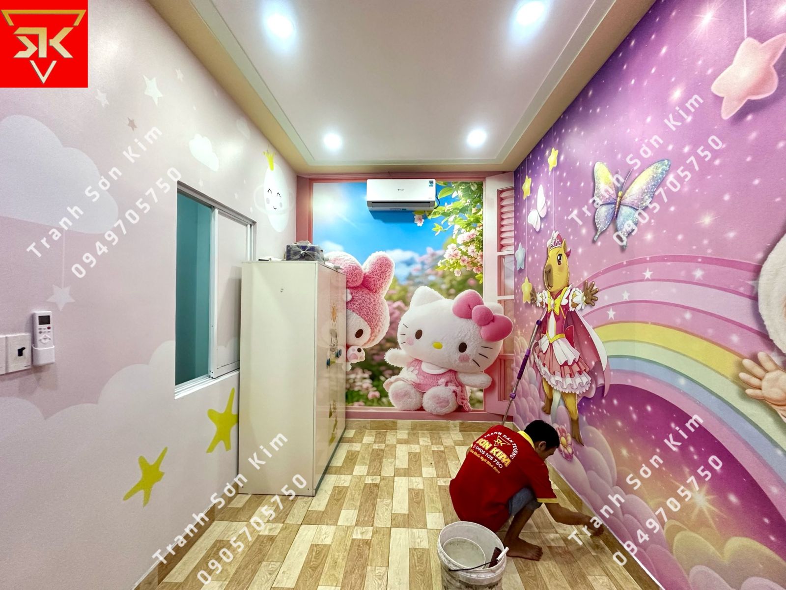 thi công tranh dán tường 3D Hello Kitty cho phòng ngủ bé gái