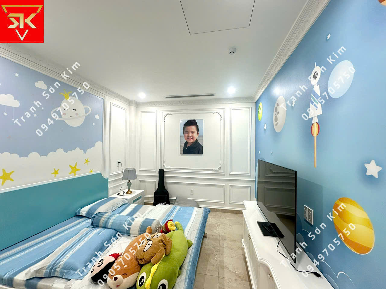 Tranh dán tường phòng trẻ em tạo không gian sinh động.