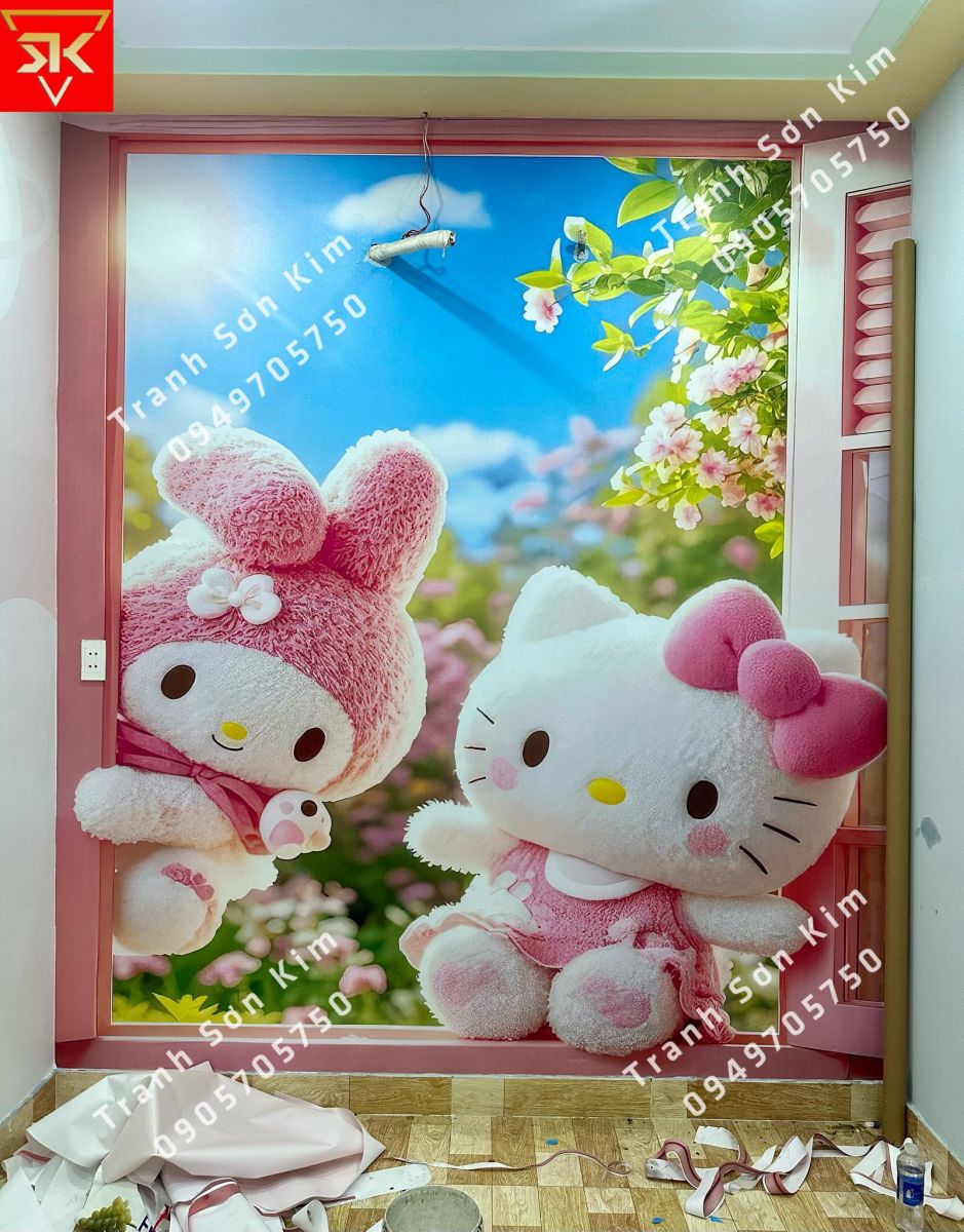 thi công tranh dán tường 3D Hello Kitty và Kuromi cho phòng ngủ bé gái