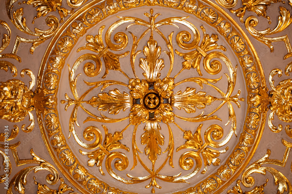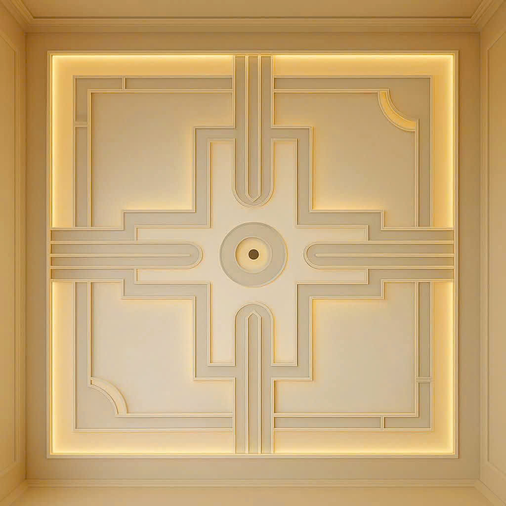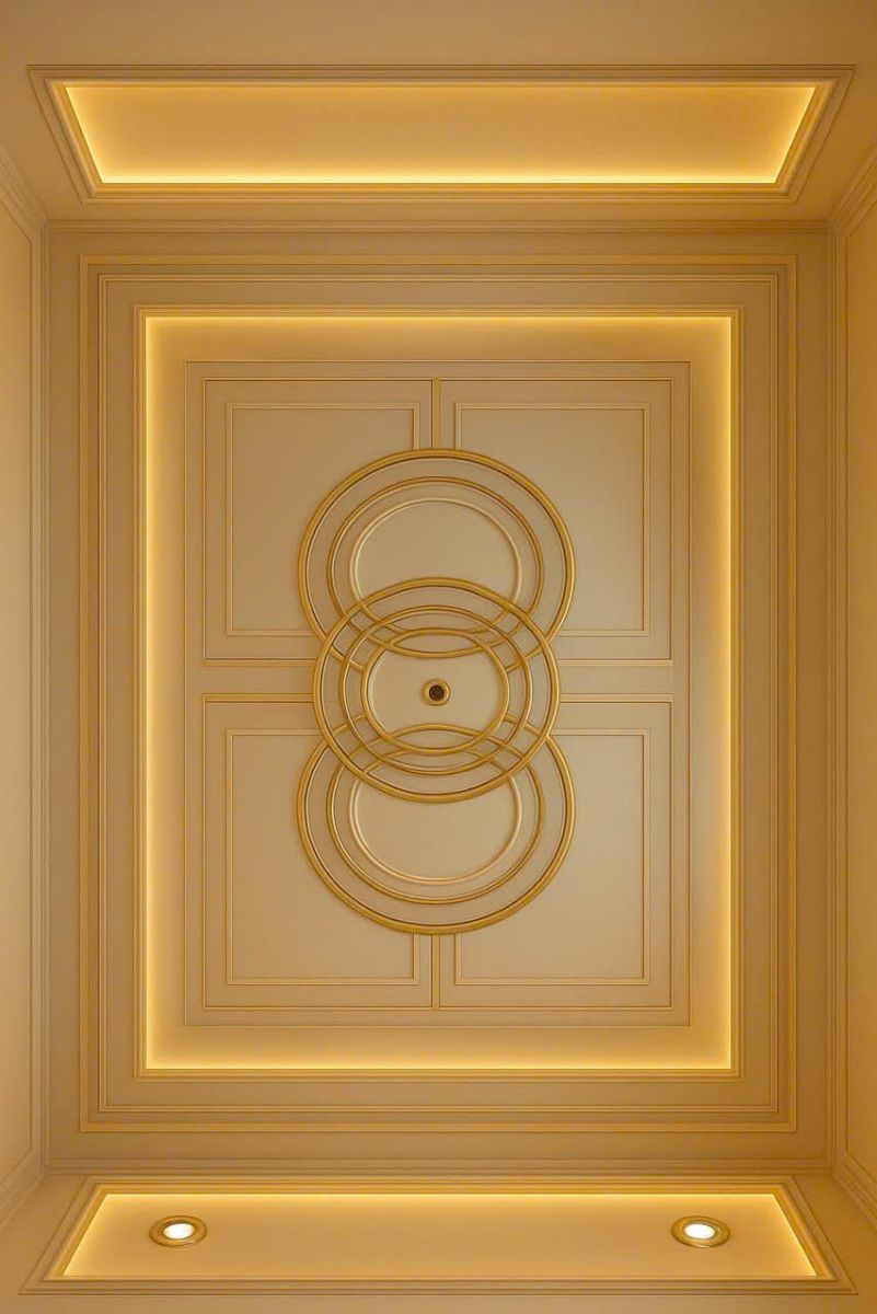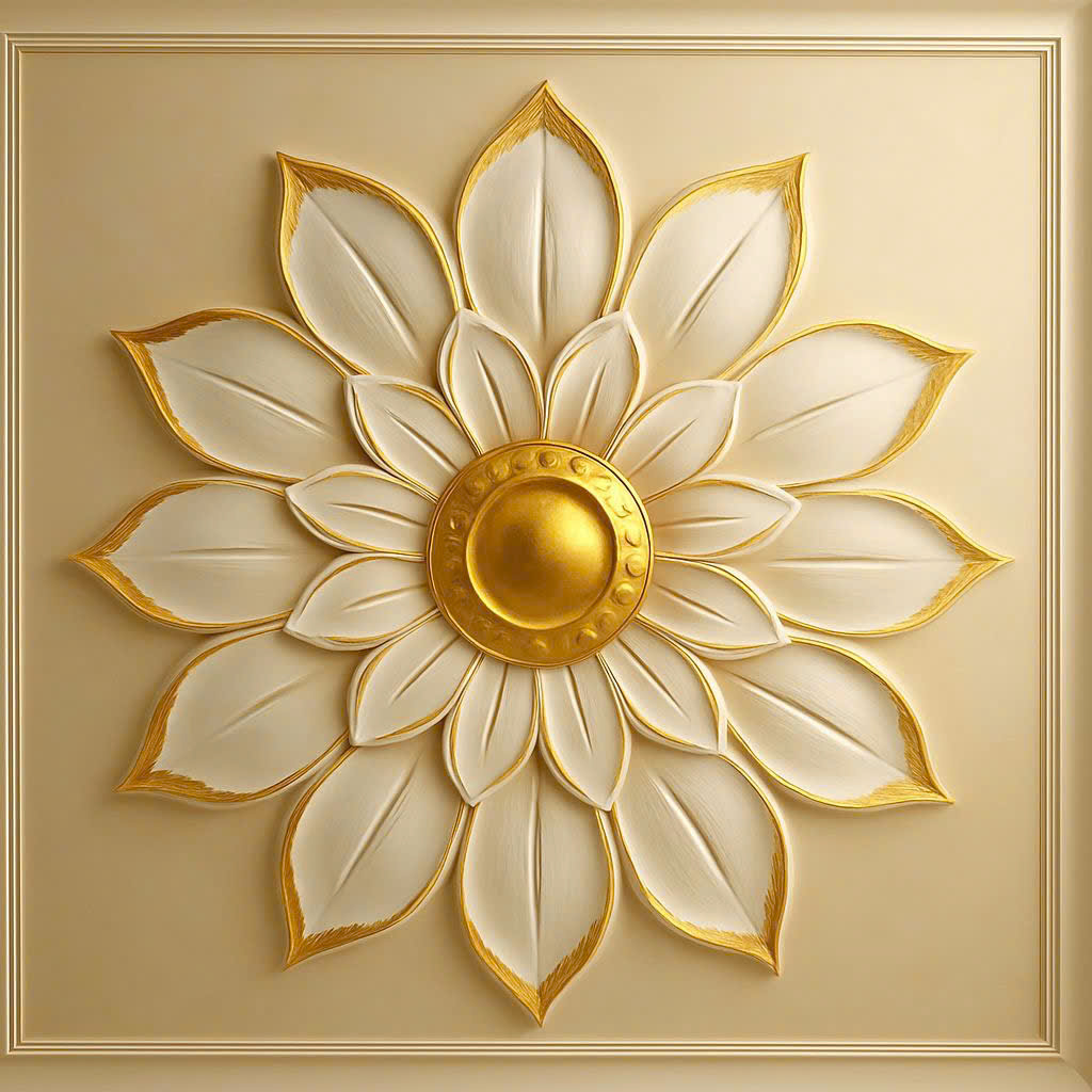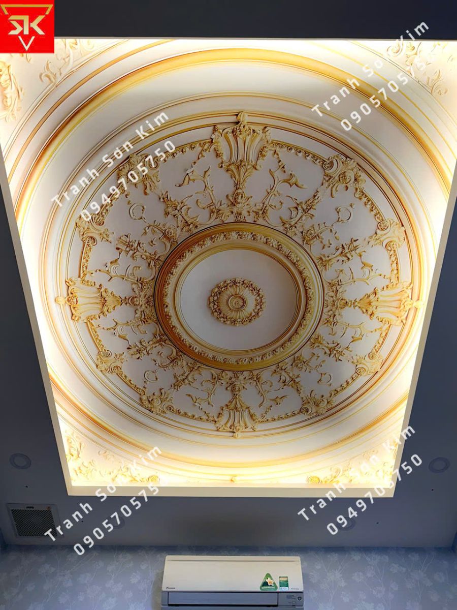 Họa tiết mái vòm vàng ánh kim được tái hiện với độ nổi 3D sống động, từng lớp hoa văn chạm trổ tinh xảo khiến người nhìn có cảm giác như đang đứng trong một hầm rượu châu Âu cổ nơi ánh sáng vàng hòa cùng mùi gỗ trầm và rượu vang quyện vào nhau. Sự kết hợp giữa màu nâu trầm của gỗ cổ điển và ánh vàng ấm của trần 3D tạo nên không gian ấm cúng, đẳng cấp, rất phù hợp cho các nhà hàng phong cách Tây Âu, hầm rượu VIP hoặc phòng tiệc riêng.