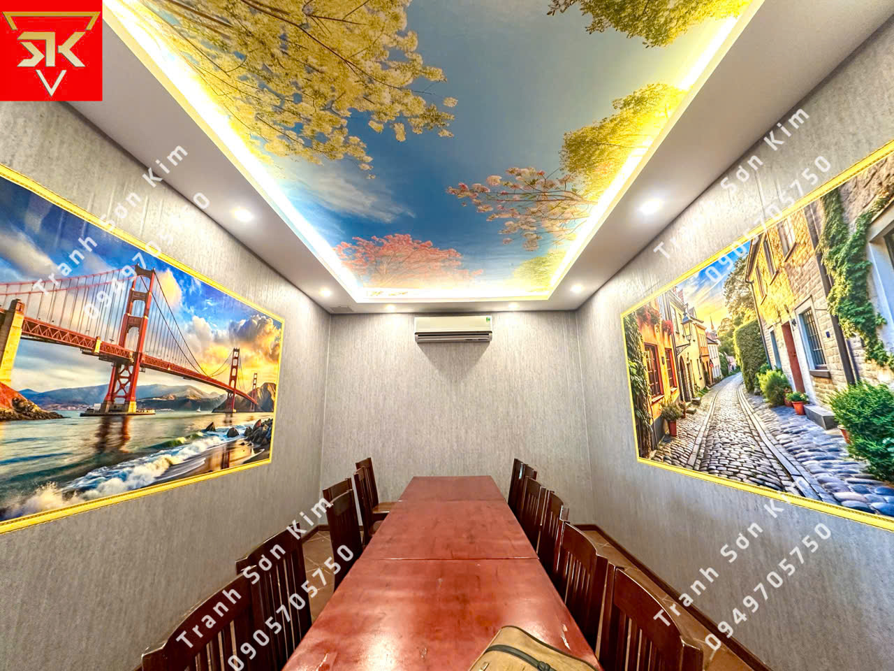Thi công tranh dán trần bầu trời phòng vip nhà hàng