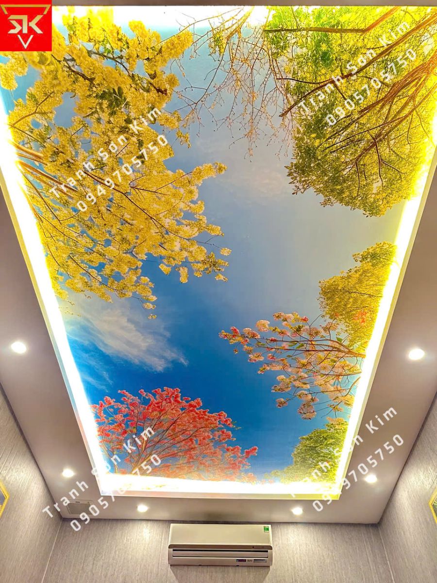 Bức tranh dán trần bầu trời hoa lá mang đến cảm giác mở rộng không gian, thoáng đãng và sang trọng cho phòng VIP nhà hàng. Ánh sáng hắt viền làm nổi bật sắc hoa bốn mùa trên nền trời xanh, tạo chiều sâu thị giác và điểm nhấn tinh tế, giúp không gian trở nên đẳng cấp, thư giãn và đầy nghệ thuật.