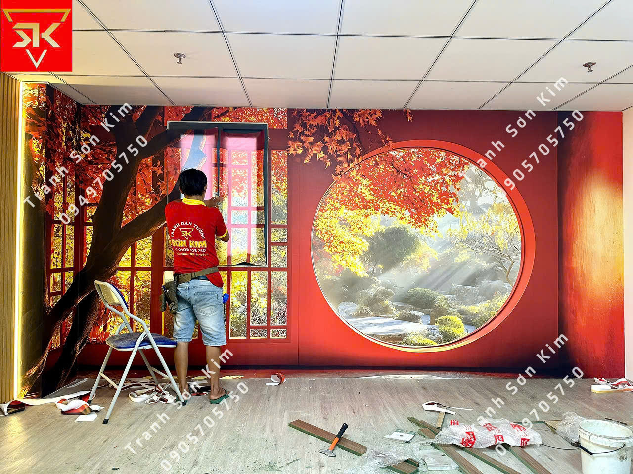 Thi công tranh dán tường phong cảnh nhật bản văn phòng công ty