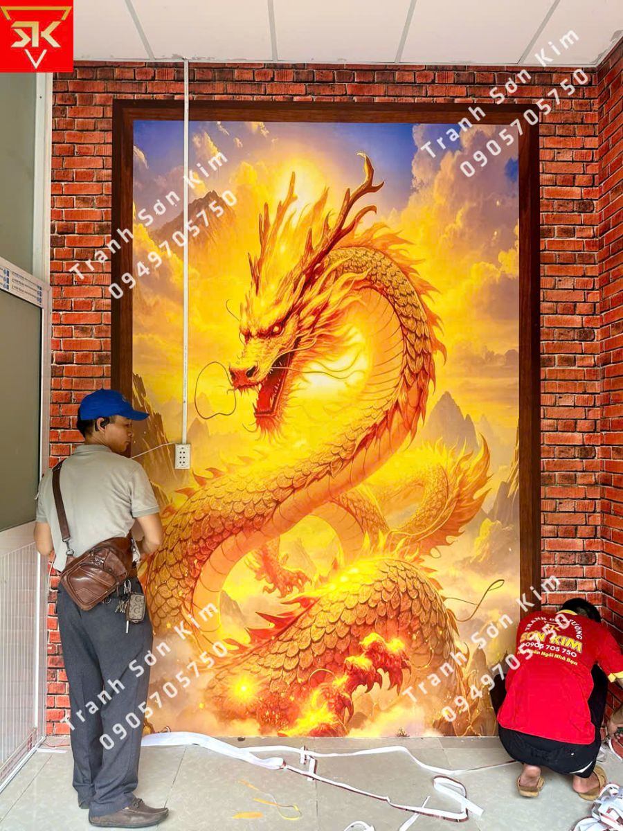 Thi công tranh dán tường hình Rồng vàng cho văn phòng công ty