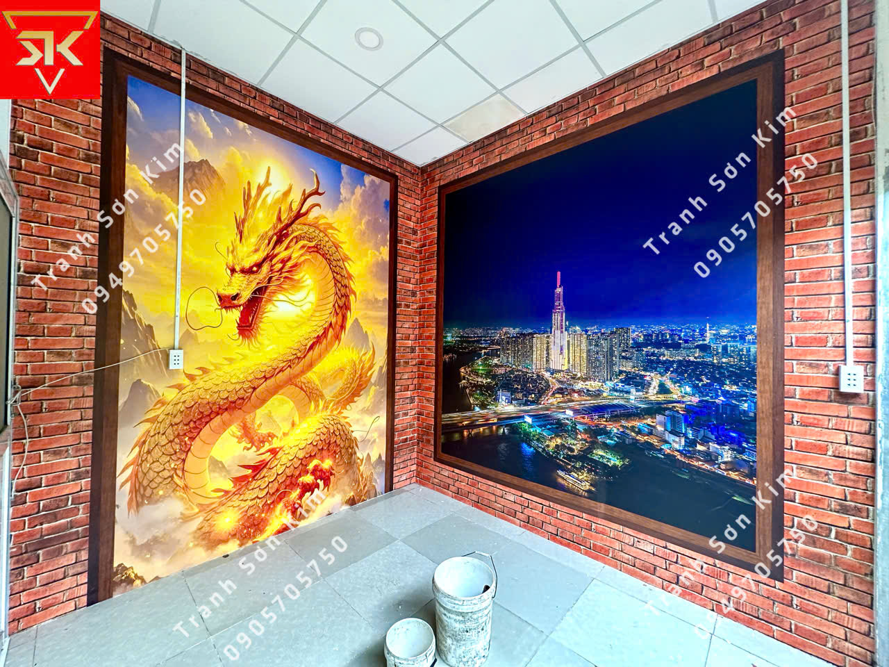 Không gian tranh rồng vàng mang lại cảm giác mạnh mẽ, uy nghi và tràn năng lượng cho văn phòng. Sắc vàng rực cùng hình ảnh rồng vươn mình giúp tăng sinh khí, thu hút tài lộc và tạo điểm nhấn sang trọng trên nền tường gạch. Đây là lựa chọn lý tưởng để truyền sự tự tin và tinh thần bứt phá trong công việc.