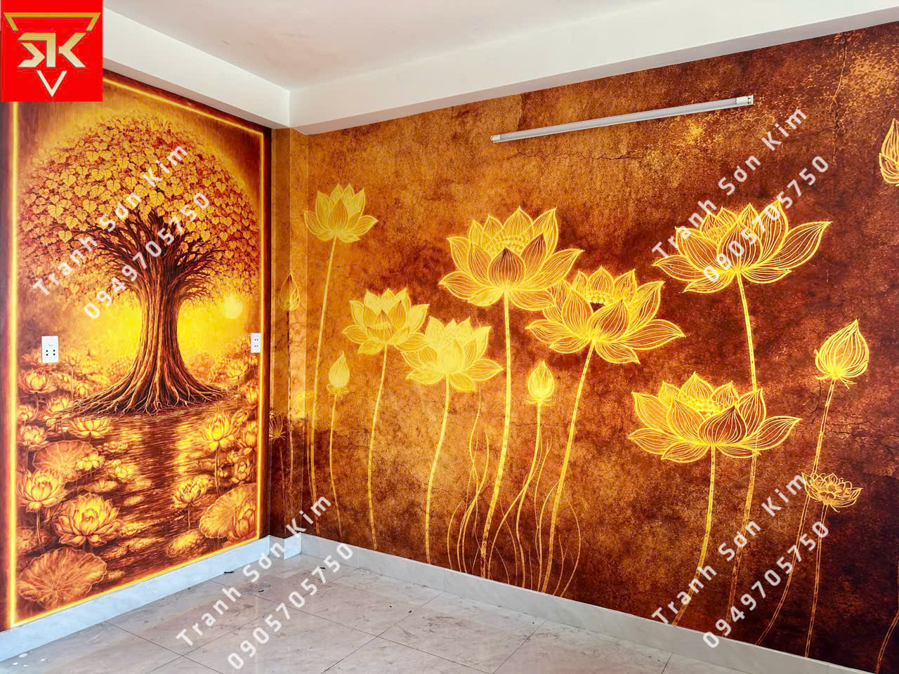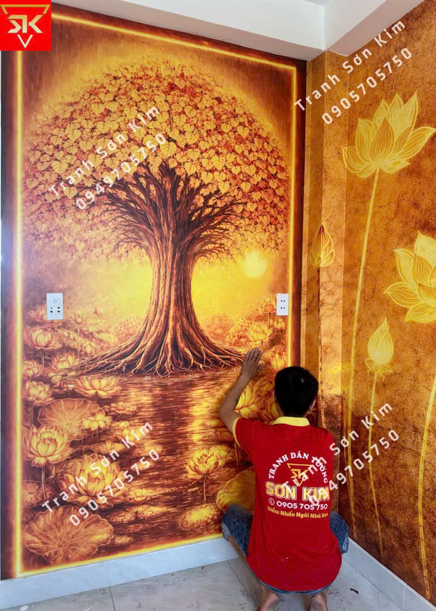 Thi công tranh dán tường cây bồ đề đẹp cho phòng thờ